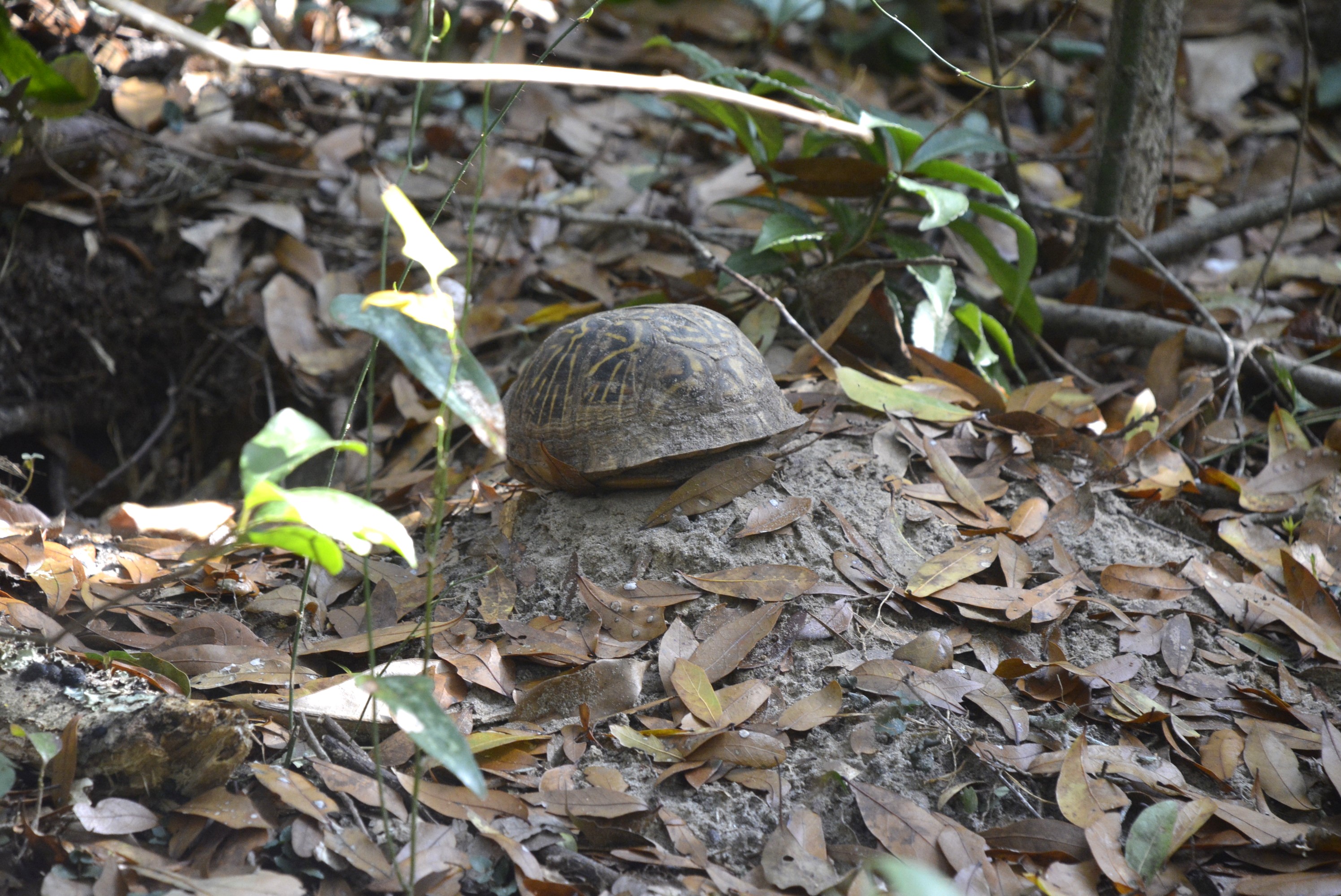 A native box turtle emerges from his home on the grounds of the Tree Hill Nature Center. Box turtles, like this one, greatly benefit from the removal of invasive plants, like the coral ardisia, that push out native plants and other items that the turtle depends on for food and shelter. (U.S. Army Corps of Engineers photo by Peggy Bebb)