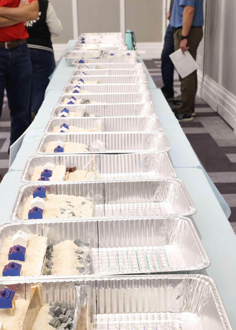 Using model homes and construction materials, students designed shoreline protection systems intended to defend structures from simulated wave energy and erosion. The challenge reflected real coastal engineering projects performed by the U.S. Army Corps of Engineers to protect communities and infrastructure.